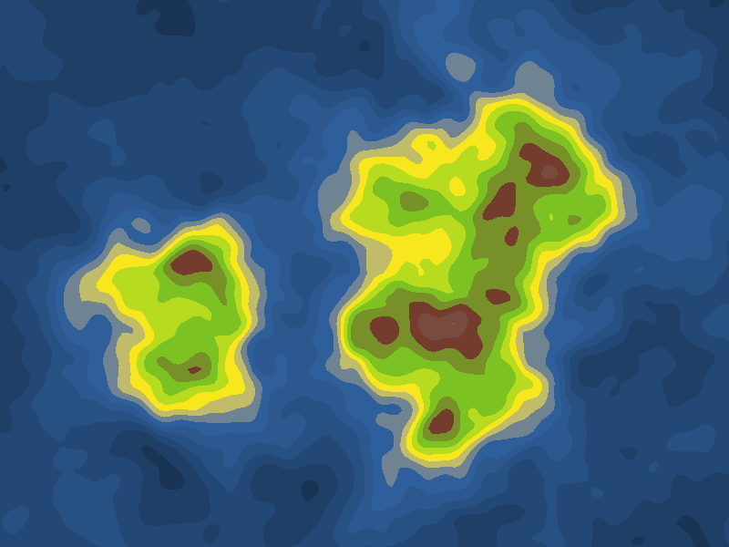One scalar field can be used for the lower bound and another the upper bounds. They will define a range of value for every point of the surface and the noise will be stretched in between. They can be built with hills like in the following illustration to give the general shape of the island.