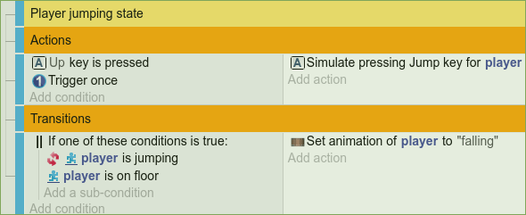 As you may have guessed, the first thing we will do is triggering the jump action once we enter the state. The force will be applied passively, so we don't have to worry about it anymore once we performed the jump. As always the last thing we need to do is find conditions that make us transit into another state. In this case we will check if the player is either not jumping or falling. If this is the case, the player gets transferred into the “falling” state.