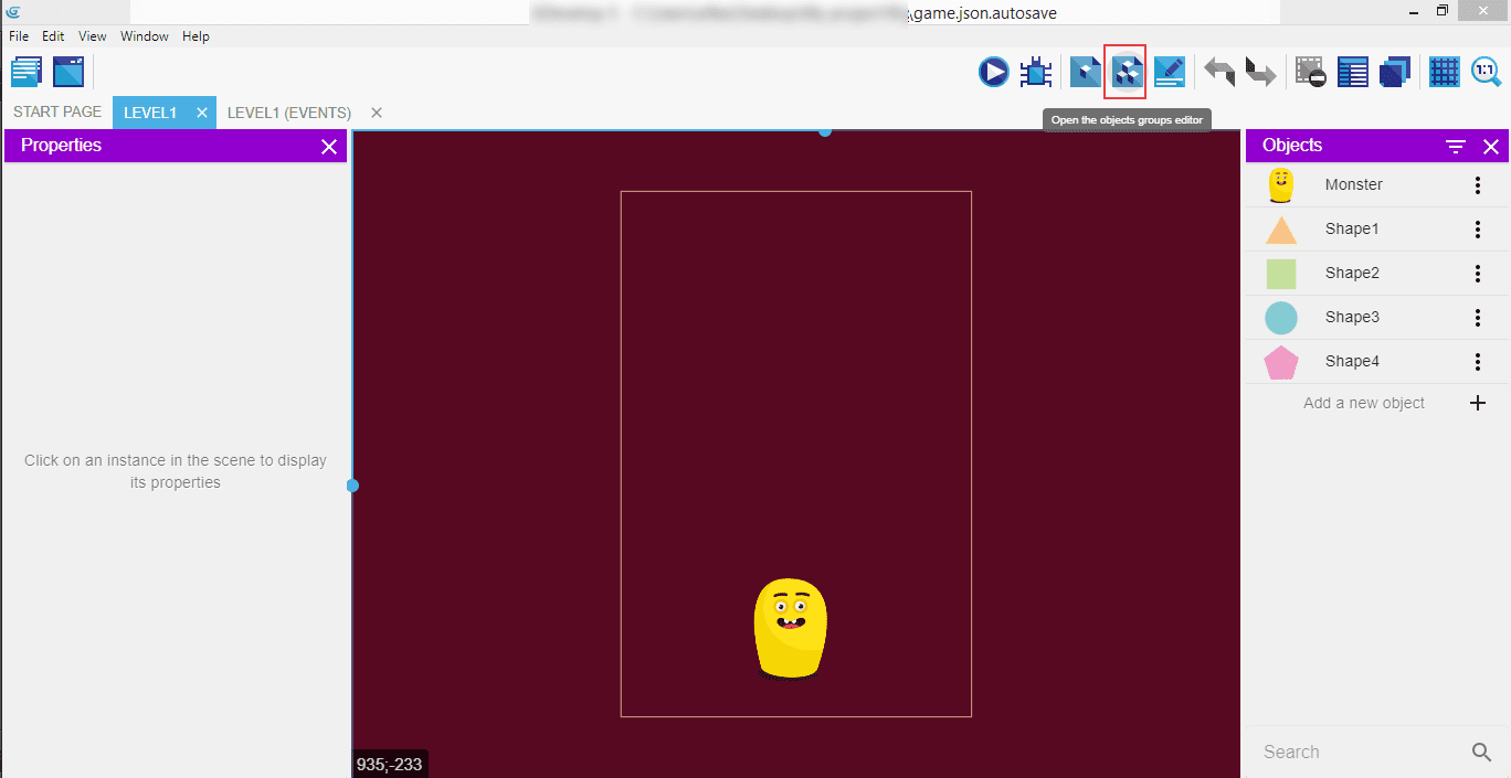 Now all the four shapes are visible in the "Objects" list in the right panel. We will group them with the "Objects" groups editor - click on the fourth icon in the top right menu, the one that have three cubes on it.