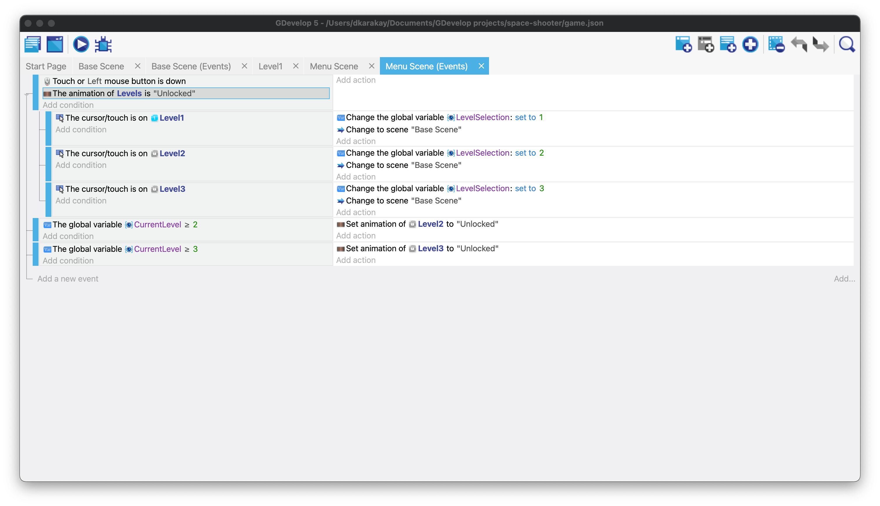 Create a new global variable called "LevelSelection" and set its initial value to 1. Then, change this variable to open the specific level (e.g., change it to 2 to load Level 2). Then add an action to run Base Scene. In the end, your events should look like this:
