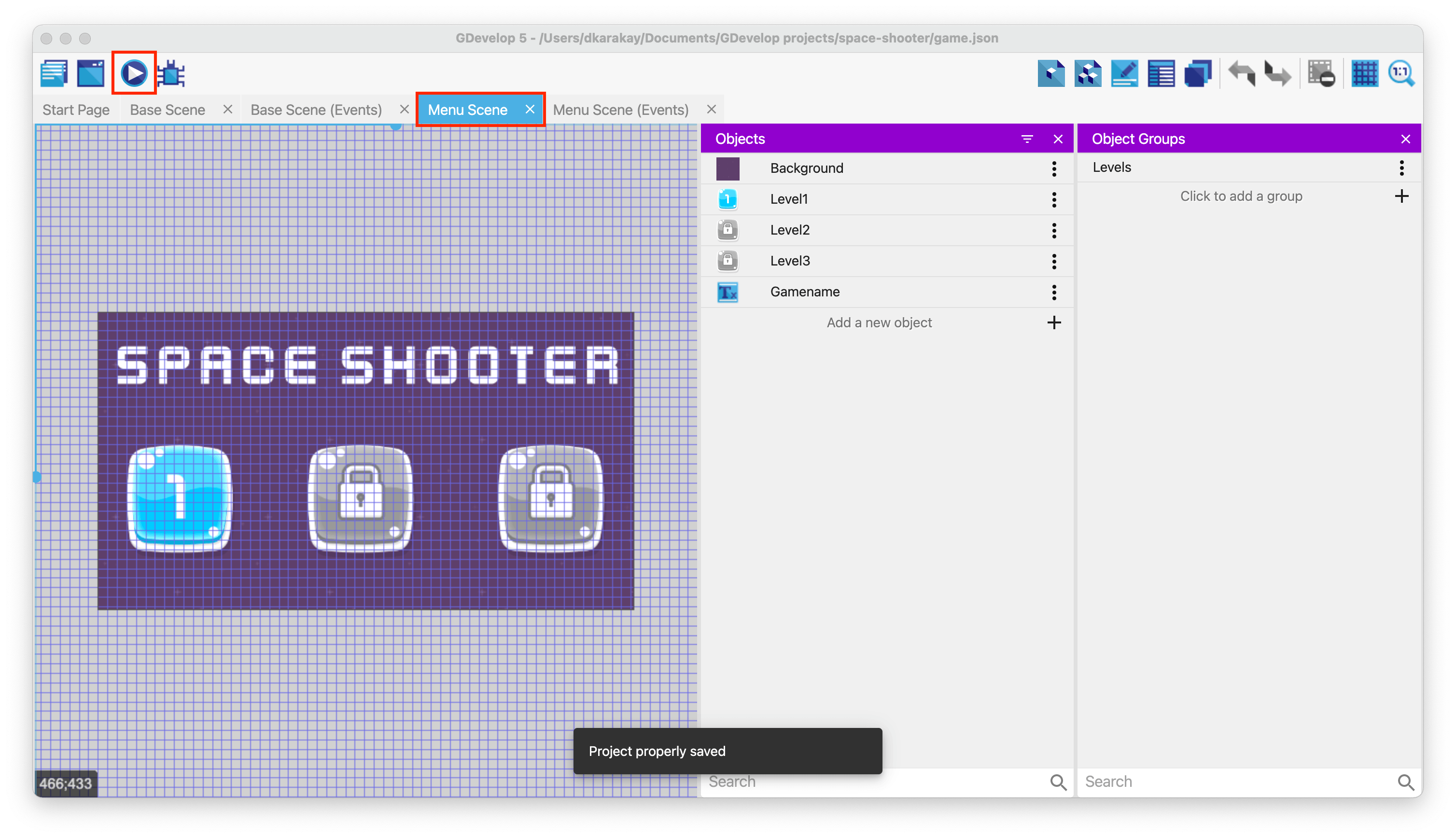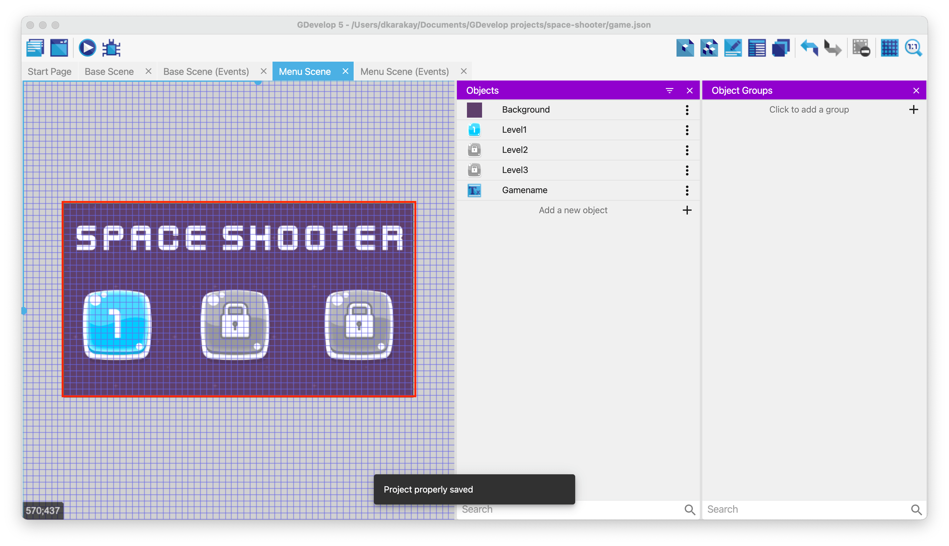 Then, create an object group for level objects called Levels.
