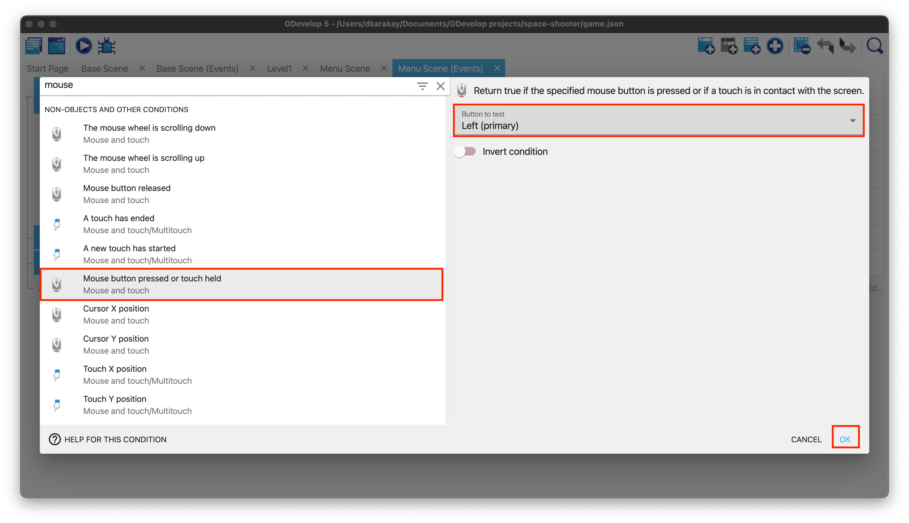 Open the events tab, and add a new event to check if the left button of the mouse has been pressed or not. We will use this to select level buttons.